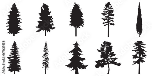 Silhouette of pine trees, Silhouettes of Christmas trees, various types . Silhouettes of evergreen trees in a forest setting .