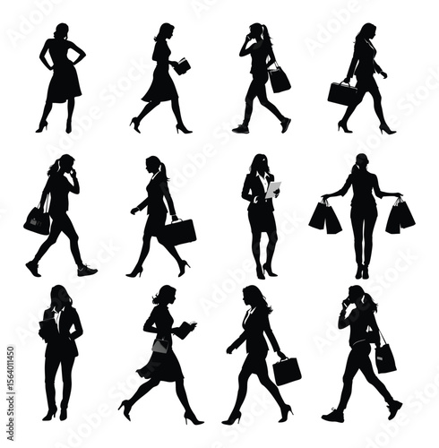 Fashionable women silhouette shopping, elegant female shoppers, black outline, style concept, luxury bags, modern retail lifestyle, high heels