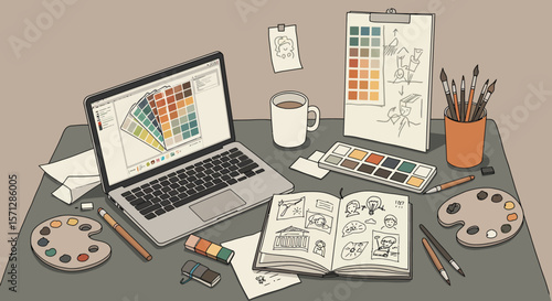 Illustration of creative workspace with digital tablet, laptop, sketchbook and coffee showcasing