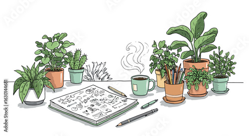 Outline sketchbook routine icon isolated on white background pencils paper and mug clean black and white line art with slightly hand drawn strokes calm artistic moment style