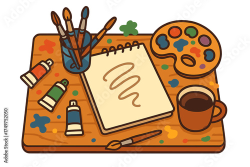 An assortment of art supplies including paints brushes and a sketchbook for creativity.
