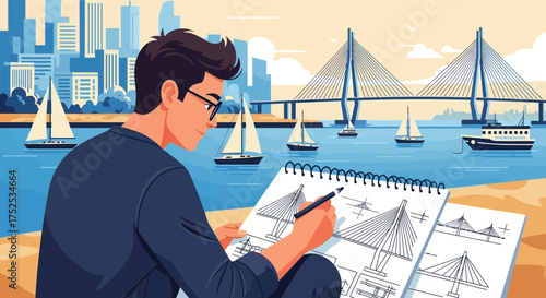 Reflective Cliffside Creativity. Contemplative view. Person sitting on cliff ledge with sketchbook or camera;