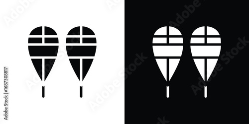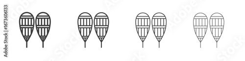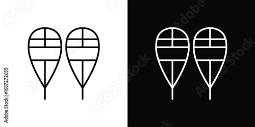 Black outline vector icon of two simplistic snowshoe designs with a minimalistic and modern style, featuring straps and bindings.