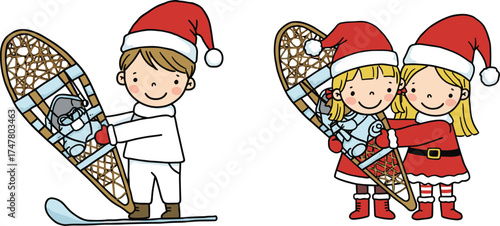 Line art of snowshoeing group hiking in winter, outdoor adventure illustration