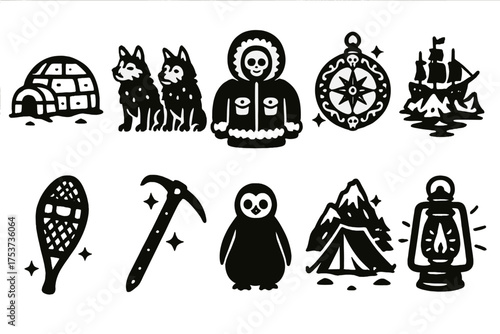 Arctic Iconography. Arctic Traditions linear icon set. igloo, kayak, snowshoe, fur coat, sled dog, fish, harpoon, seal, lantern, snowflake, drum, boot