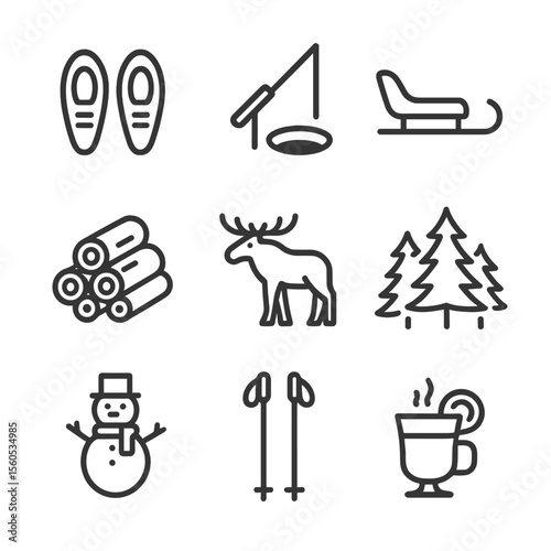 Winter adventure icons: snowshoeing, skiing, and trail signs in linear style