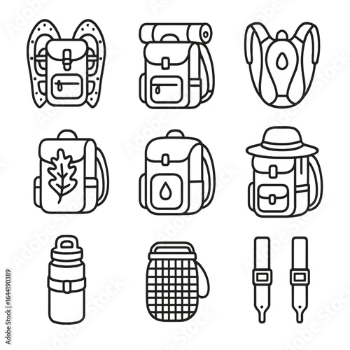 Outdoor adventure gear with backpacks, climbing equipment, and snowshoes in isometric style