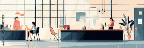 vector illustration of a modern, open-plan office interior, rendered in a clean and spacious style