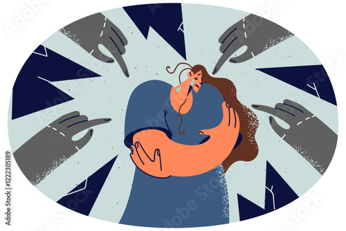 Woman suffer from bullying. Teenagers abuses young girl. Suffer from insults and bullying. Negative feelings and emotions. Mental and psychological trauma. Flat vector illustration