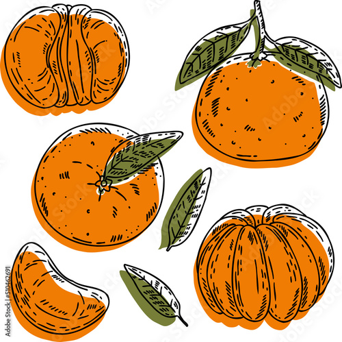 Fresh hand-drawn orange vector illustration, hand-drawn tangerine illustration, citrus with leaves, sliced orange, tangerine, oranges, tangerine fruit pattern, healthy food, vitamins, menu, drink menu
