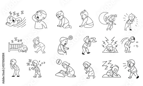 Baby sleep problems and tantrum line icon set. Vector pictograms of an infant awake, exhausted toddler, yawning, sleepless, crying and having a meltdown. Childcare.