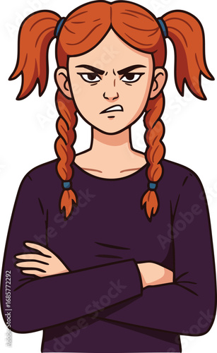 Angry redhead girl with braided hair and crossed arms expressing frustration vector illustration
