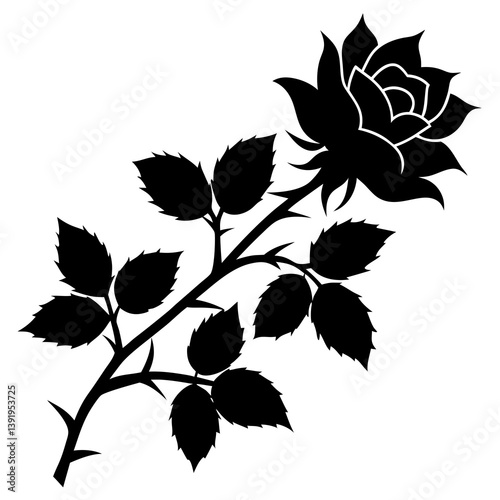 Graphic silhouette branch with leaves and thorns
