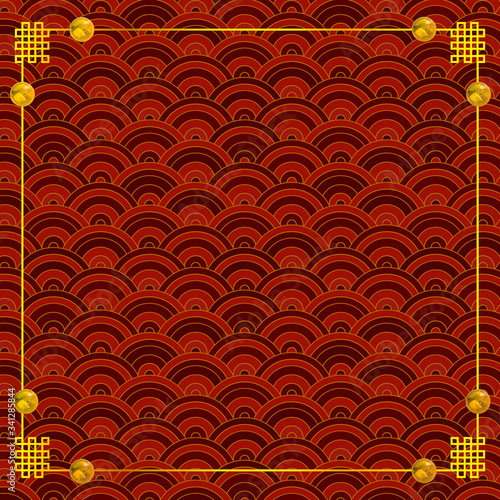 Vector colorful oriental traditional frame, golden color, red geometric pattern on the background, border template.