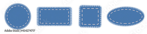Set of 4 geometric denim shapes circle and square. Realistic texture for fabric label element. Blue patchwork material.
