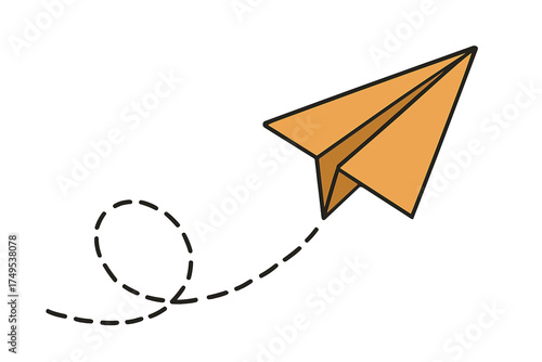 Minimalist line art icon of a paper airplane flying along a dashed, looping path trajectory