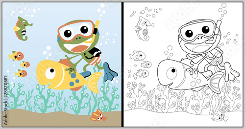 vector cartoon of underwater life with frog and fishes, coloring book or page