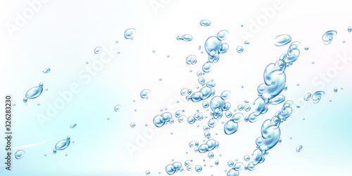 Boiling water, abstract background with air bubbles on liquid surface, dynamic motion, transparent aqua, randomly moving seether or fizzing, template for advertising, Realistic 3d vector illustration