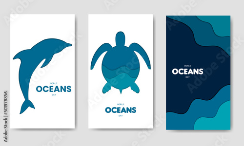 World Ocean Day greeting card with turtle, coral reef and fish on water background. Vector cartoon illustration for June 8