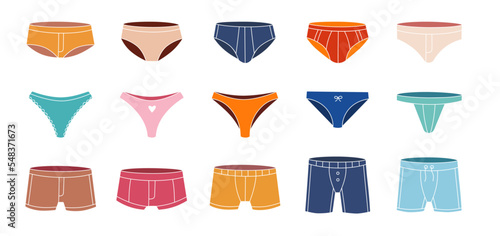 Colorful underpants set. Female and male underpants. Colorful swimwear. Personal underclothing apparel. Classic boxers, trunks, bikini, strings, thong