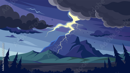 A thunderstorm rolling in its jagged lightning bolts and dark clouds creating a shadow of fear over the once serene landscape..