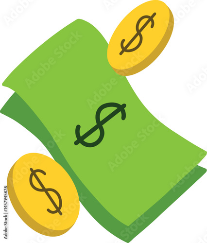 Stylized financial illustration depicting two currency designs with usd amounts on transparent background.
