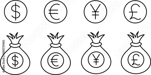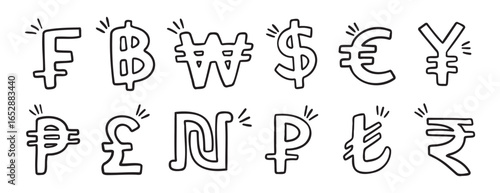 currency hand drawn doodle symbol set. Outline drawing different currency stroke line clipart symbol collection