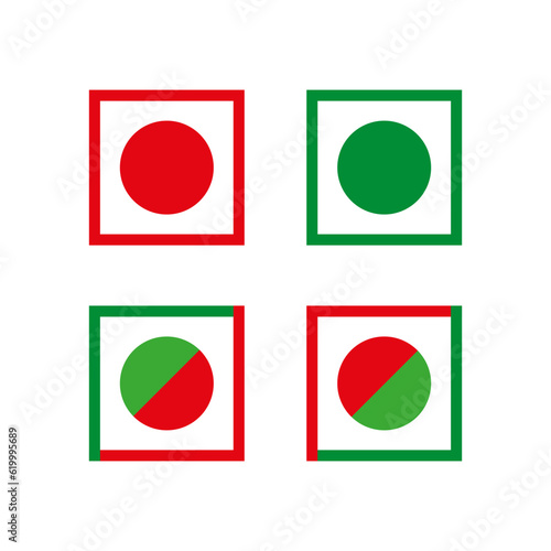 Veg Non-veg food indication dots set pure chemical, egg food, medical. Veg and Non-veg indication in different colours. veg Non-veg dot icons, Colourful veg and Non-veg symbol. vector icon.