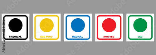 Veg Non-veg food indication dots set with pure chemical in white background, egg food, medical, veg and non-veg indication in different colors. Veg Non-Veg dot icons. Colorful veg and non-veg symbol.