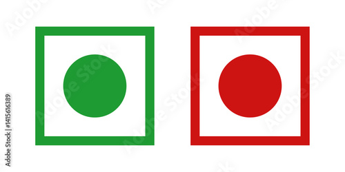 Two square icons with rounded corners one red and one green each containing a solid circle inside centered. Red and green food classification icons. Veg non veg dietary square labels
