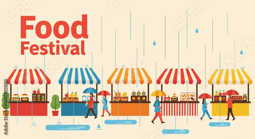 Colorful Market Stalls with Vendors and Customers in a Flat Vector Illustration
