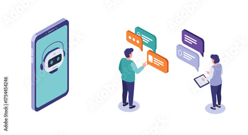 Interactive chatbot technology concept with user and digital communication in 3d isometric style