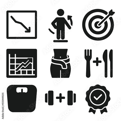Weight Management Icons. Solid style icons of weight management: weight loss graph, gain tracker, target weight icon, scale symbol