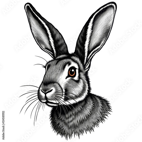Detailed black and white engraving of a sitting rabbit with textured fur and whiskers