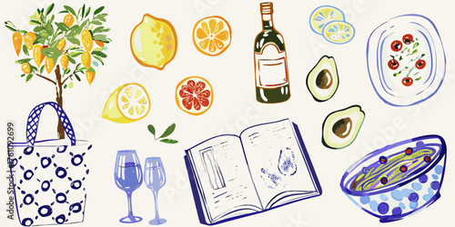A vibrant collection of summer picnic elements including a lemon tree citrus fruits wine bottle avocados and a meal