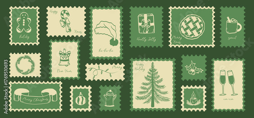 Vector illustration Christmas postage stamps. Sticker with print with image of candle, Christmas tree, pie, bow, gingerbread, wine glasses, Christmas wreath for poster, placard or print.