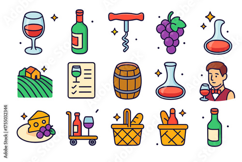 Wine Tasting Icons. Wine Tasting Tours. Colorful isometric vector icons set of Wine Tasting Tours: wine glass, wine bottle, corkscrew, grape cluster, vineyard,