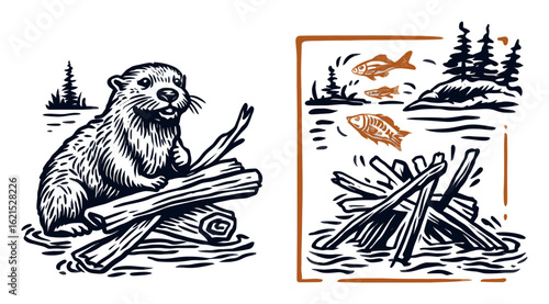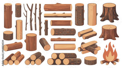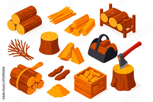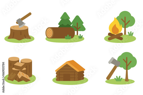 Woodworking essentials for outdoor activities with stacked logs, chopping axe, firewood pile, and campfire illustration, vector cartoon collection for camping and nature enthusiasts