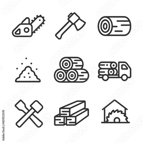 Set of Icons for Lumberjack, Logging Equipment, and Wood Processing