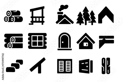 Collection of woodpile and firewood bundle icons in a simple black and white silhouette style