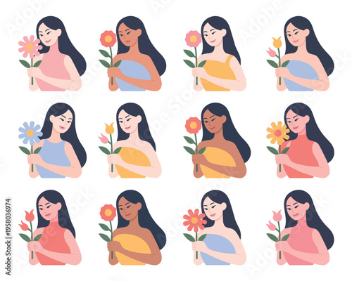10 step hair care routine, flat vector illustration. Washing hair with shampoo, wiping, brushing, applying heat protector, shine serum and drying with hairdryer.