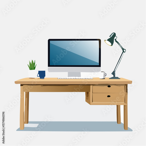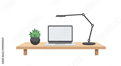 3d desk lamp on wooden table lights up empty posters on a wall. Vector illustration. Copy space for text template
