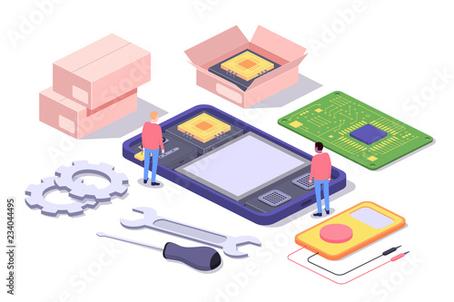 5g mobile phone with IoT app, flat vector isometric illustration. Internet of things, smart home technologies. 5g cellular network connecting machines, objects and devices.