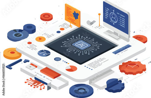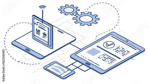 5g mobile phone with IoT app, flat vector isometric illustration. Internet of things, smart home technologies. 5g cellular network connecting machines, objects and devices.