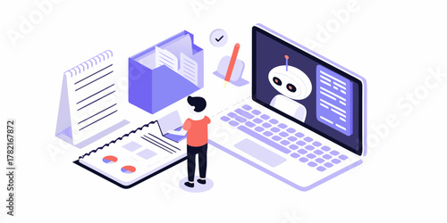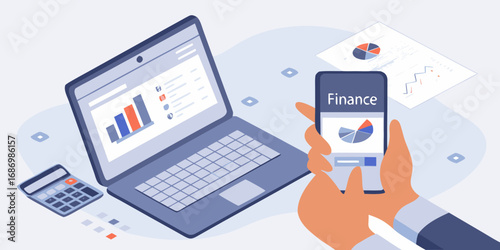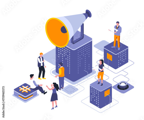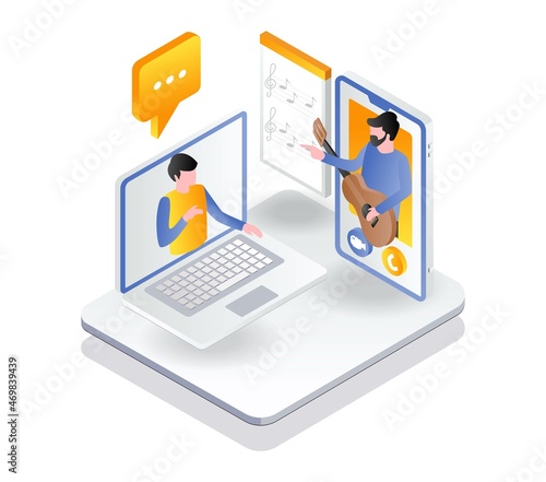 5G wifi high speed internet fllowchart, vector isometric illustration. Businessman looking at internet speed meter on laptop screen. Smartphone, satellite, router, data cloud.