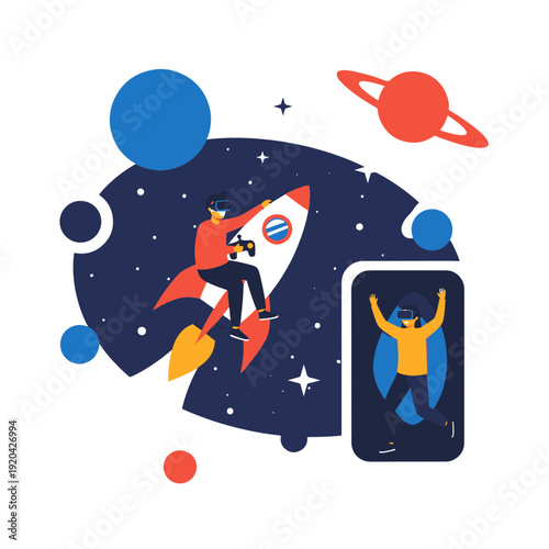 5g network, global high speed internet, flat vector illustration. Rocket flying around planet Earth globe. 5g wireless technology.