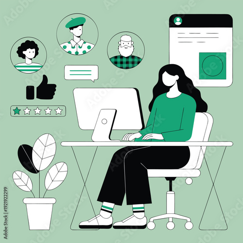 8 March, Womens Day. Happy woman enjoying her day off, having breakfast in the morning at home, flat vector illustration. Cute girl sitting at table, eating and drinking coffee. Happy holiday.