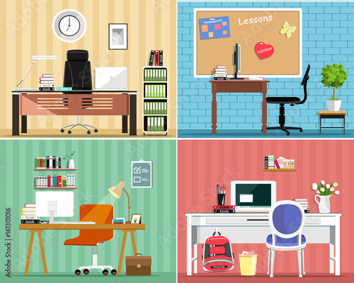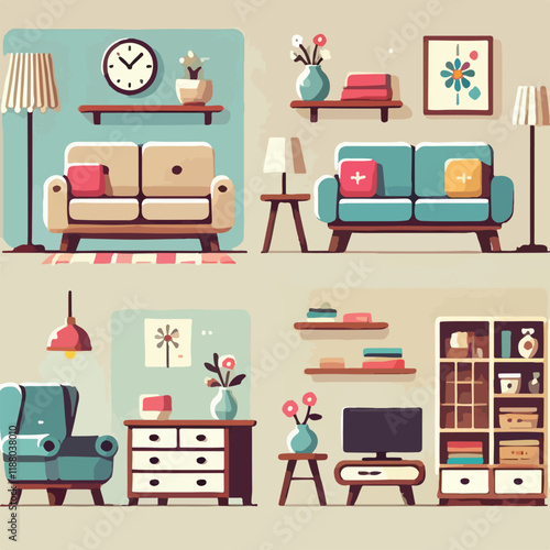 Adult female living room interior, vector flat illustration. Cozy room with furniture, books and houseplants on shelves, lamp, books, photo and mobile phone on night table, sewing machine etc.