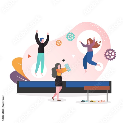 Young people having fun while bouncing on trampoline, vector illustration. Trampoline for adults, sport and recreation concept for web banner, website page etc.