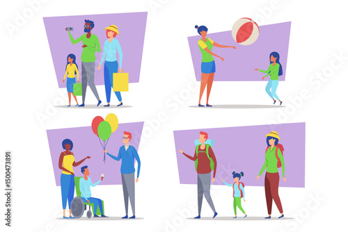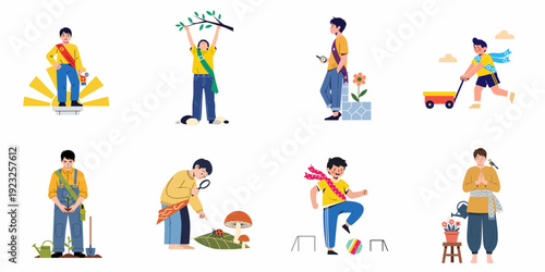 Adults and kids standing, sitting in different poses, isometric icon set, flat vector isolated illustration. Office people, lab technicians, children with laptop, mobile phone, tablet, pencil.